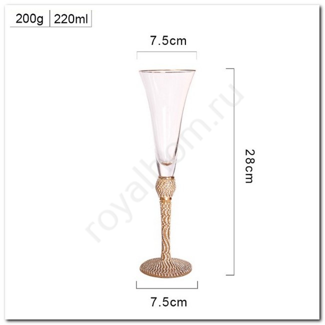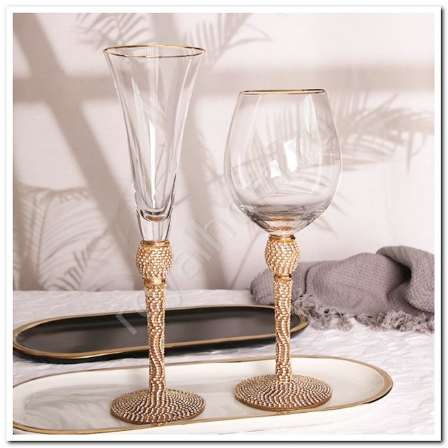 Каждый бокал украшен роскошной ножкой, инкрустированной сверкающими стразами, которые создают эффект блеска и добавляют нотку шика к вашему столу. Золотая окантовка подчеркивает утонченность формы, превращая этот набор в настоящий объект восхищения.
