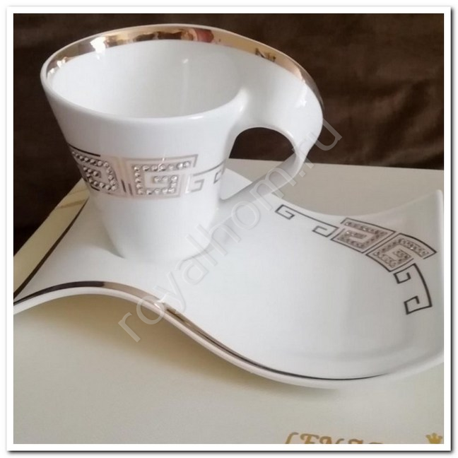 Кофейная пара выполнена с использованием высококачественных страз и дополнен золотой окантовкой. Стразы остаются на посуде, даже после многократного использования. Все изделия в коллекции необычной эргономичной формы, что позволяет идеально вписать их при сервировке стола, так же они займут меньше места, чем обычные тарелки.