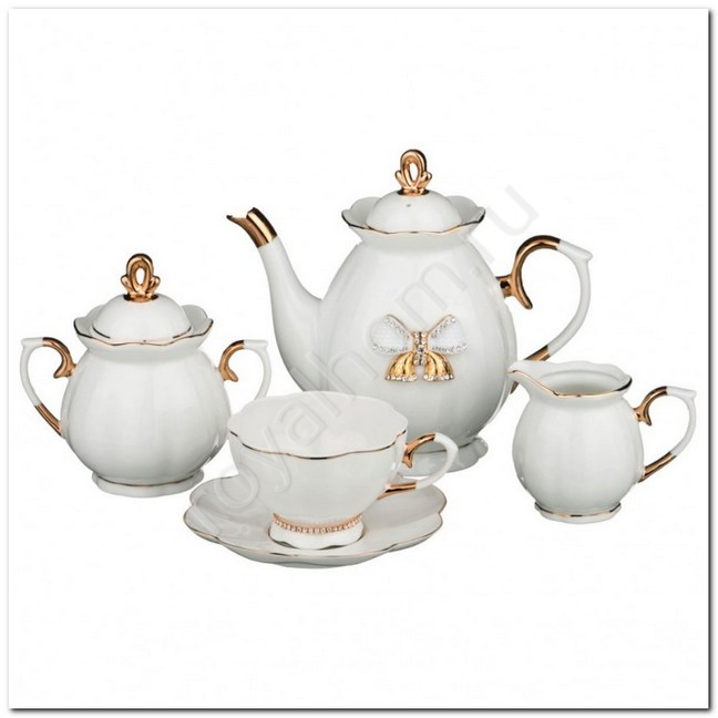 Чайный сервиз выполнен с использованием высококачественных страз и дополнен золотой окантовкой. Стразы остаются на посуде, даже после многократного использования. Все изделия в коллекции необычной эргономичной формы, что позволяет идеально вписать их при сервировке стола, так же они займут меньше места, чем обычные тарелки.