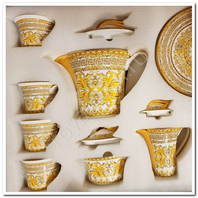 Чайный сервиз костяной фарфор дизайн VERSACE 21 предмет Чайный набор из фарфора - отличный подарок . Он состоит из красивых чашек и кружек, которые станут настоящим украшением дома или офиса. Набор выполнен в классическом стиле и подойдет для любого интерьера. Чашки и кружки изготовлены из высококачественного фарфора, что делает их прочными и долговечными. Каждая чашка и кружка имеет уникальный дизайн, который придаст особый шарм вашему чаепитию. Этот набор станет отличным подарком для любителей чая и создаст атмосферу уюта и комфорта на Вашем столе Набор:.6 чашек 0,25 л, 6 блюдец 15,5 см, 6 десертных тарелок 21 см, чайник 1,36 л, сахарница 0,25 л, молочник 0,25 л