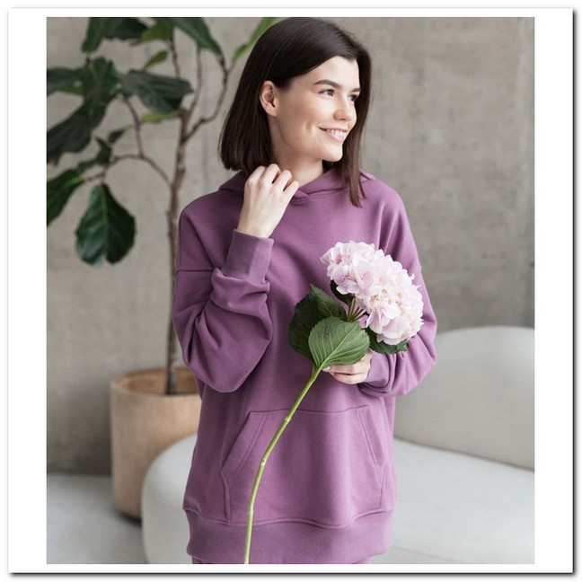 Внутри мягкие хлопковые петельки, которые не дадут замерзнуть в прохладные дни.На модели костюм с худи оверсайз мини в сиреневом цвете, также актуален и зимой и летом.