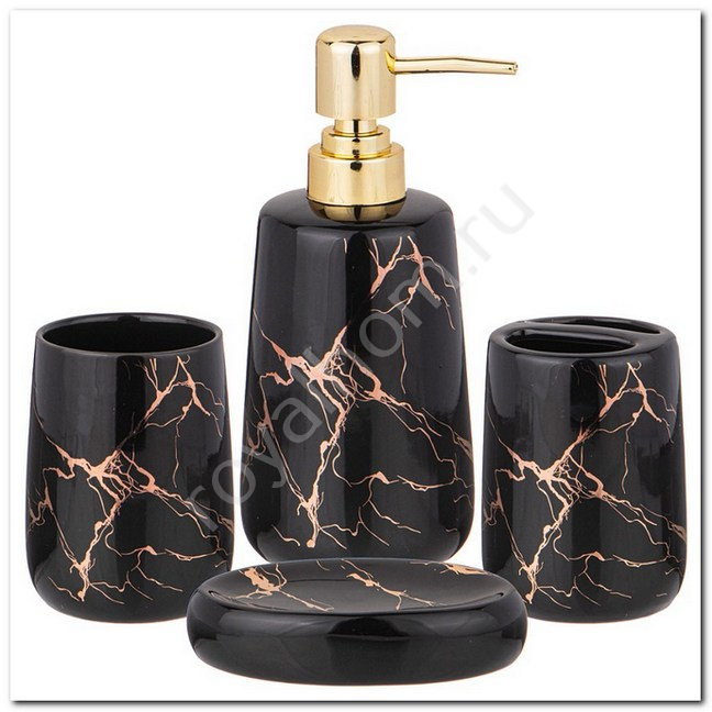 Набор для ванной комнаты  включает подставку для зубных щеток, мыльницу и диспенсер для жидкого мыла с дозатором, стакан. Набор высокого качества. Все элементы выдержаны в одном стиле, что позволяет создать в ванной комнате стильный и оригинальный ансамбль. Такой набор аксессуаров придаст интерьеру вашей ванной комнаты элегантность и современность.