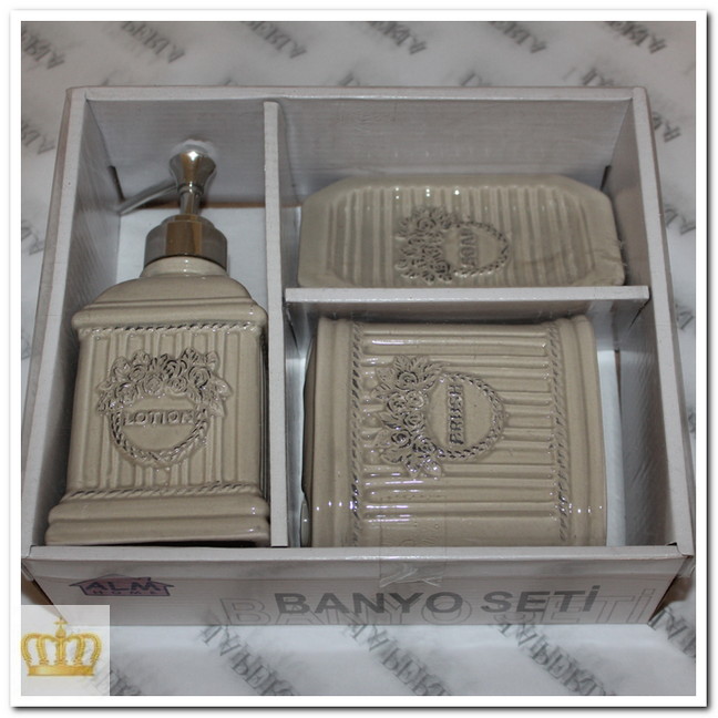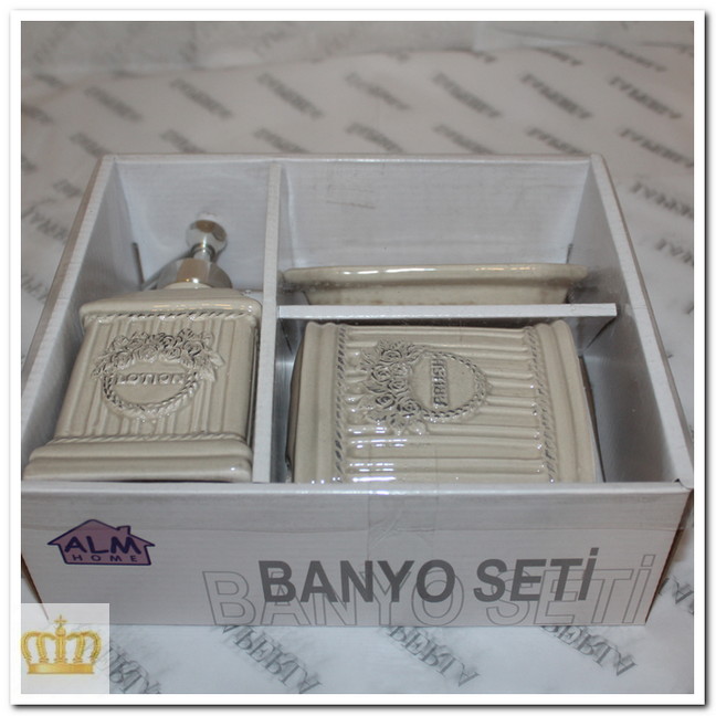 Набор для ванной комнатыBANYO SETI включает  подставку для зубных щеток, мыльницу и диспенсер для жидкого мыла с дозатором. Набор  высокого качества. Все элементы выдержаны в одном стиле, что позволяет создать в ванной комнате стильный и оригинальный ансамбль. Такой набор аксессуаров придаст интерьеру вашей ванной комнаты элегантность и современность.