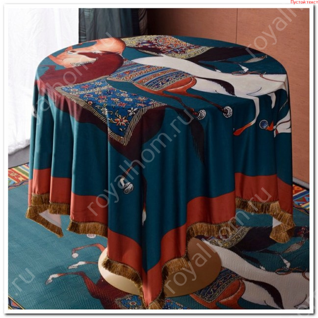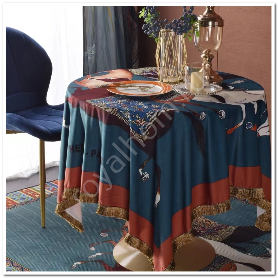 Эта бархатная скатерть размером 150х150 см выполнена в изысканном дизайне Hermes и относится к премиум-классу. Глубокий синий цвет основы идеально сочетается с яркими акцентами красного и золотого, а также изысканными узорами, что делает её настоящим произведением искусства. Окантовка золотистыми элементами придаёт изделию дополнительный шарм и подчёркивает его статусность.