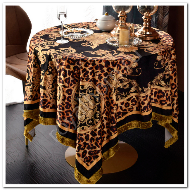 Эта бархатная скатерть размером 150х150 см выполнена в роскошном дизайне, вдохновленном стилем Versace. Она сочетает в себе богатую леопардовую текстуру с золотыми элементами и изысканными декоративными узорами, что придает изделию элегантность и статусность. По краям скатерти проходит изящная окантовка, которая подчеркивает ее премиальность и создает завершенный вид.