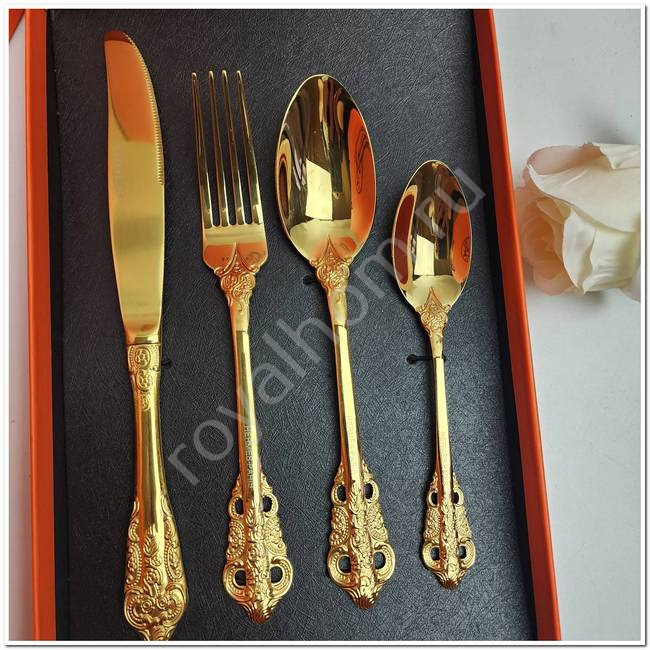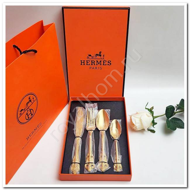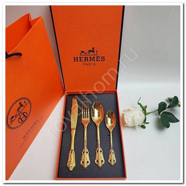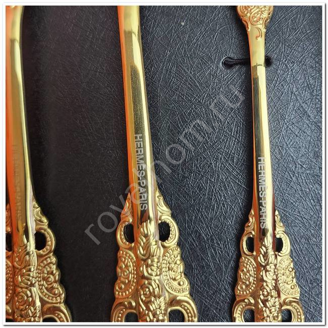 Каждый предмет набора выполнен из металла с позолотой, украшен изысканным тиснением и фирменной гравировкой "Hermes Paris". Ручки столовых приборов декорированы утонченными орнаментами, подчеркивающими внимание бренда к деталям.