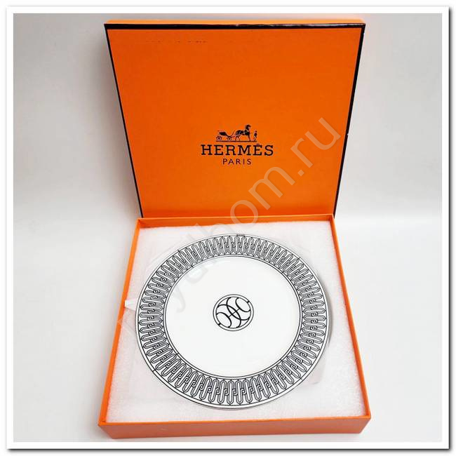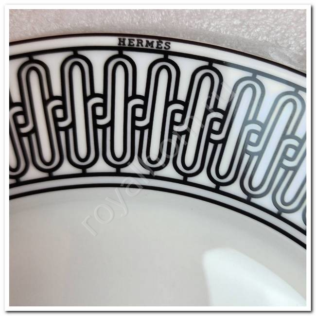 Большая тарелка (27 см): выполнена из высококачественного фарфора с утонченным орнаментом по краю в виде геометрического узора. В центре тарелки размещен изящный логотип Hermès, подчеркивающий принадлежность к легендарному французскому бренду.