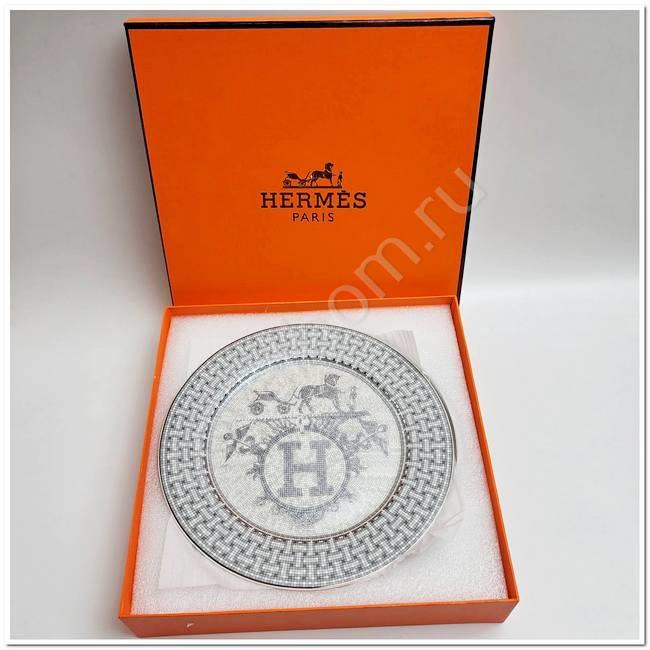 Малая тарелка (21 см): оформлена в аналогичном стиле, украшена геометрическим узором и логотипом Hermès в центре. Эта тарелка идеально подойдет для подачи закусок или десертов.