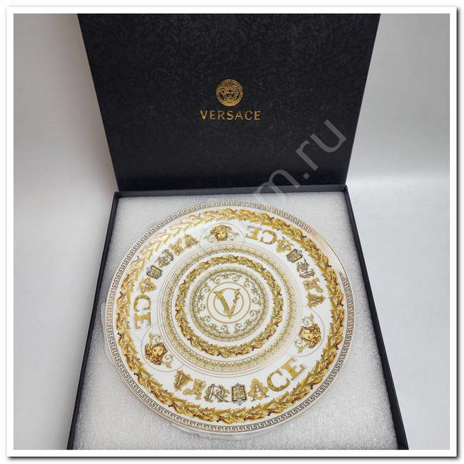 1. Большая тарелка (27 см): Имеет выразительный золотой орнамент по краю и изысканную надпись "Versace" в центре, символизирующую престиж бренда. Она идеально подойдет для подачи основных блюд, создавая атмосферу эксклюзивности.
