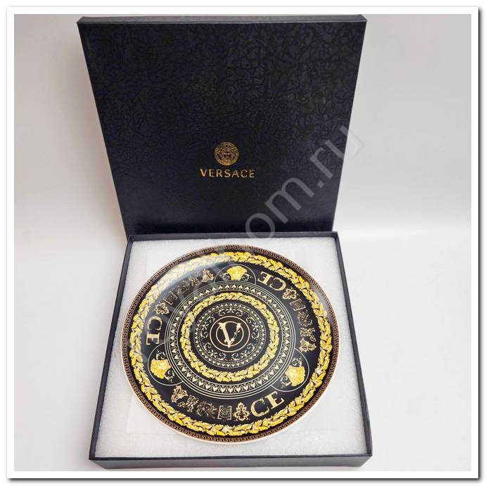 1. Большая тарелка (27 см): Имеет выразительный золотой орнамент по краю и изысканную надпись "Versace" в центре, символизирующую престиж бренда. Она идеально подойдет для подачи основных блюд, создавая атмосферу эксклюзивности.