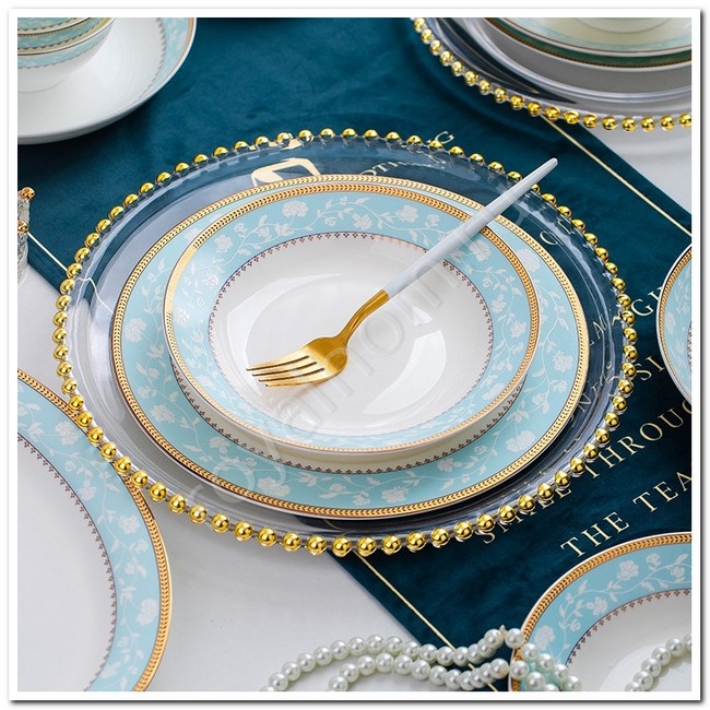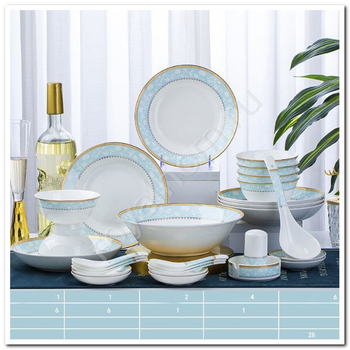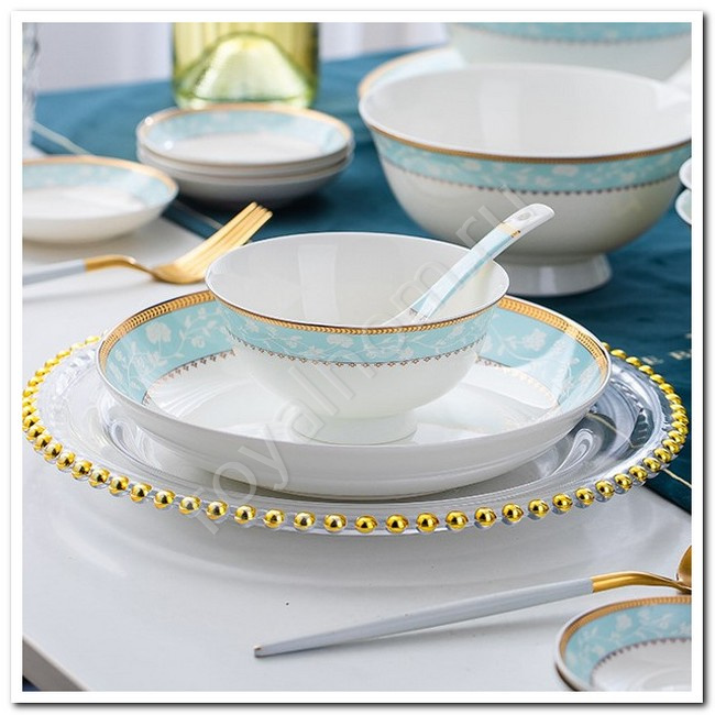 Изысканный дизайн: Сервиз выполнен из премиального фарфора с утонченными золотистыми и нежно-голубыми элементами, которые придают посуде легкость и благородство. Каждый предмет продуман до мелочей, создавая гармоничный ансамбль для вашего стола.