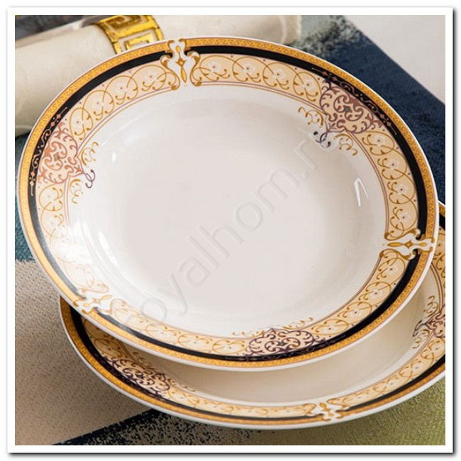 Изысканный дизайн: Сервиз выполнен из премиального фарфора с утонченными золотистыми и нежно-коричневыми элементами, которые придают посуде легкость и благородство. Каждый предмет продуман до мелочей, создавая гармоничный ансамбль для вашего стола.