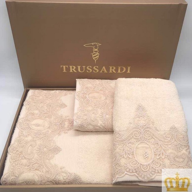 Комплект из 3 махровых полотенец Trussardi нежного бежевого цвета воплотил в себе все черты известного бренда: безупречное исполнение, роскошный дизайн, умеренность и элегантность. Полотенца изготовлены из экологичного и высокопрочного хлопка, который не требует сложного ухода и при этом сохраняет все свои свойства максимально длительное время.