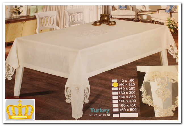 Изысканная скатерть с отделкой по периметру оригинальным широким кружевом - великолепное украшение любого стола и праздника. Скатерть тканная с добавлением нитей люрекса, которые создают неповторимый матовый отблеск и перелив - красиво, дорого, необычно!