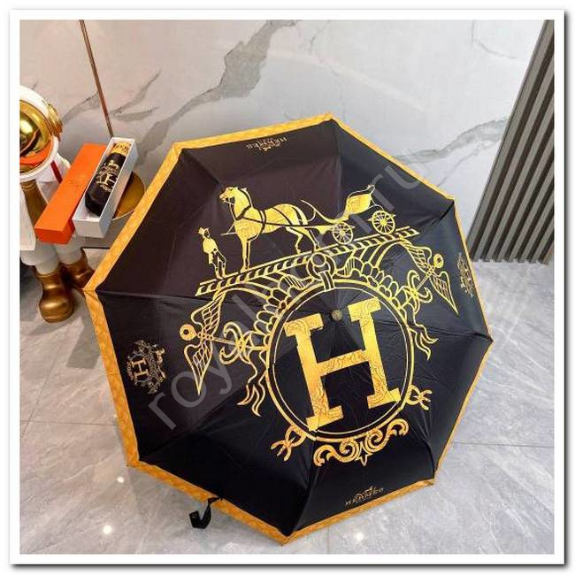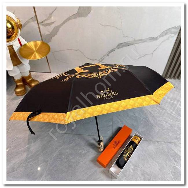 У нас можно купить зонт  Hermes  с логотипом, который смотрится оригинально, подойдет для личного пользования или в качестве подарка. Конструкция отличается автоматическим механизмом складывания (3 сложения), 9 спицами, оснащена системой антиветер. Вес зонта составляет до 500 гр, диаметр купола – 110 см. Это недорогой, но надежный аксессуар для мужчин и женщин которые ценят качественные вещи. У нас большой каталог, низкие цены, быстрая доставка